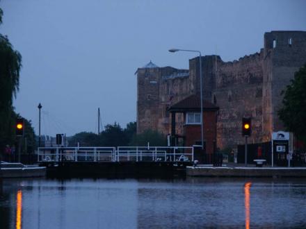 Looking downstream, Newark Town Lock awaits. On the right is a dry dock which utilises the original lock, 1 quarter the size of the new lock. The control panels are on the island between the locks.