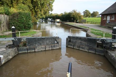 From Bunbury Locks the winding hole can just about be seen, just past the bush on the left.