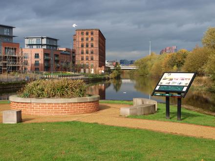 Gates and navigation channel are (were) to the left of this image: weir stream is (was) to the right. After opening of the Leeds Flood Alleviation scheme in 2017, the navigation channel became to the right and the channel through the gates was blocked by a new low-level bridge.