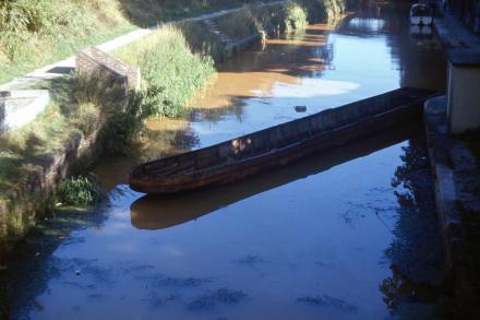 1977 The narrowboat which for many years discouraged navigators approaching the old tunnel. Now filled-in and safety-boat usually moored at the same place.
