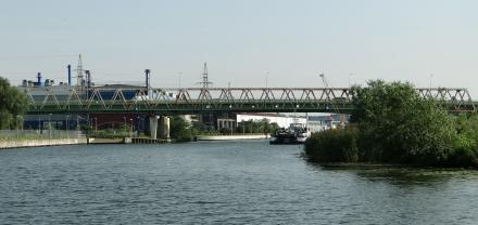 The first bridge crossing the river is behind the camera upstream of the canal junction we have just left.