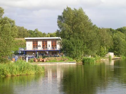 The Kingfisher cafe with balcony overlooking the marina sits above the office and facilities block. Just past the marina entrance is the mooring for all services.