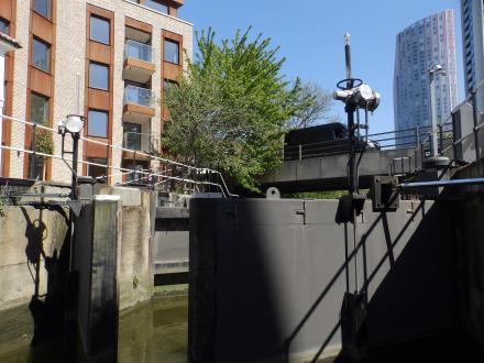 There are gates to work both ways - no longer required since the building of Three Mills Lock