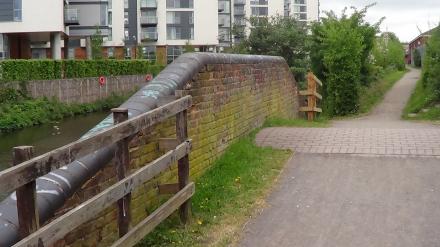 The towpath across the junction bridge drops down to the canal just beyond the fence