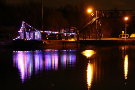 A chilly November evening, but cheered up by Christmas lights on a boat moored next to the footbridge.