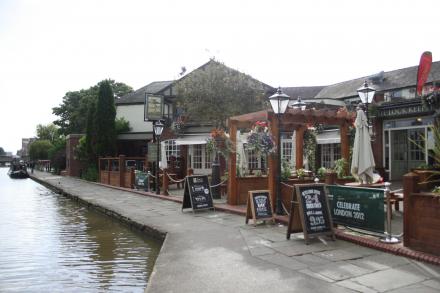 This is the pub/restaurant immediately opposite the winding hole. Nice food, although a little pricey. Tesco's is behind the pub, convenient for these moorings. There is a pathway just off shot to the right that leads to the road. The actual entrance to Tesco is about 75 to 100 meters up the road.