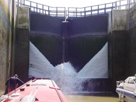 The big radial top gates are cracked open slightly to fill the lock. There is a floating pontoon on each side of the lock, which rises with the boat. The gentleman in the picture (our pilot) is standing on that pontoon.