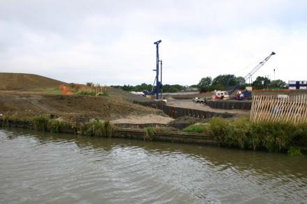 The partially constructed new cut at Two Mile Bend where the canal has been diverted for the construction of the next stage of the Gloucester Ring Road
