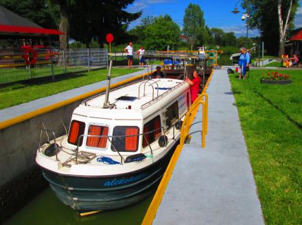 Stare Jablonki direction is at the head of the lock and our overnight hotel is a short walk over the bridge camera right.