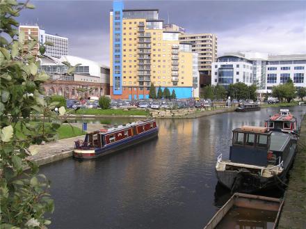 The railway station is the white arched building to the left, and beyond the boat is one of many high-rise apartment buildings sprouting in the centre of Leeds. Office Lock no.2 is behind the camera.