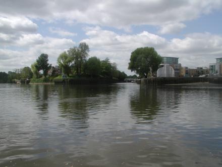 Heading towards Teddington, keeping left - and Brentford Lock is visible to the right