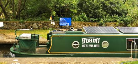 Huami in the Salterhebble Guillotine Bottom Lock. Rather a nightmare for a single-handed boater and better to wait until some kind person can give you a hand. Getting in is not the problem but the guillotine is key operated so you need to be in two places at the same time. Open the guillotine and drive your boat out. Because this is a guillotine and not an inward opening gate you can get 2 boats in together.