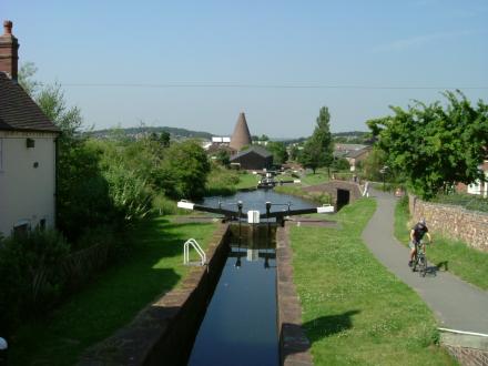 This is the view from lock 5 (or there abouts) down the Stourbridge 16. The cone of the Stuart Crystal factory can be seen on the left of the canal.