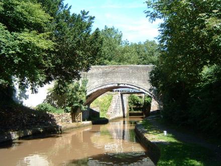 The bridge number plate is partly obscured by trees adjacent to towpath.