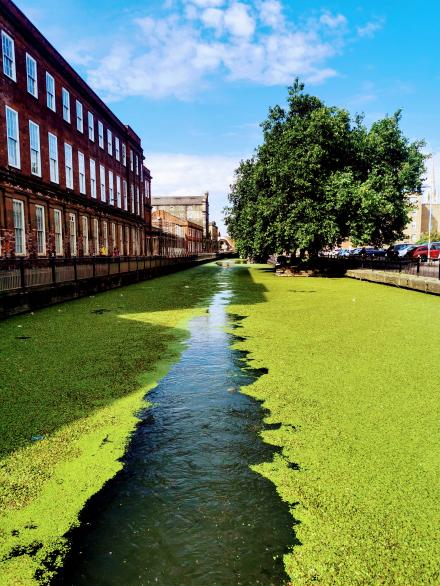 Cutting through the weed approaching Stamp End Lock. Just a light covering of weed with remarkably clear water underneath. Some boats with water-cooled engines were experiencing some blocked filters although I had no problems at all.