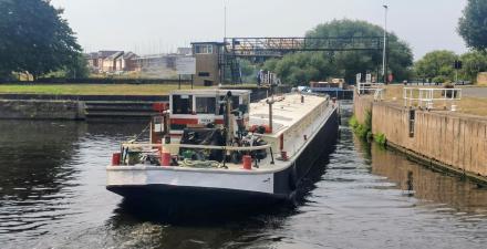 I was using the CRT services at the flood locks when two very large commercial boats very cleverly make the tight turning through the two locks that are not aligned with each other. They sounded their loud horns to warn oncoming traffic as it is a very blind corner (also for small narrowboats).