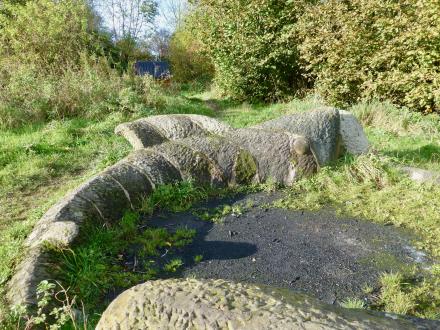 Another fine sculpture created by Thompson Dagnall. They were constructed and then carved from stone recycled from the site. Just to the west on the towpath, near the bench, are a small number of stone horse prints.