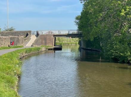 Coates Bridge, No. 154A, carries Skipton Road, the B6252, over the canal and towpath. There is towpath access via easy steps with narrow ramp each side to make cycle access easy.