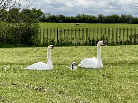 The swan that was watching made a sound they all as one heads up and looking in the same direction.