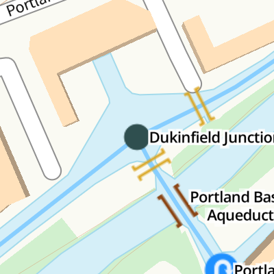 It is adjacent to Portland Basin, and the names are often used as synonyms by boaters, whilst locals refer only to Portland Basin. Strictly speaking, Portland Basin is the wide area on the main line of the canal. The arm under the junction bridge and the aqueduct over the River Tame were built by the Ashton Canal, and the junction with the Peak Forest canal was historically at the southern end of the aqueduct.