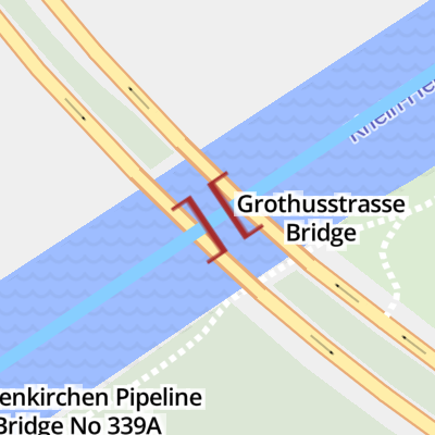 Grothusstrasse Bridge is a minor waterways place on the Rhein-Herne Kanal between Rhein - Rhein-Herne Kreuzung (Junction of the Rhine with the Rhine-Herne Kanal) (23.11 kilometres and 2 locks to the west) and Rhein-Herne – Dortmund-Ems Kreuzung (Junction of the Dortmund–Ems Canal with the Rhein-Herne Canal) (22.43 kilometres and 3 locks to the east).