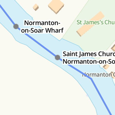 Saint James Church, Normanton-on-Soar is a minor waterways place on the Grand Union Canal (Leicester Section - River Soar Navigation) between Loughborough Branch Junction (2 miles and 1¼ furlongs and 2 locks to the southeast) and Zouch Road Bridge No 43 (Mooring between here and Zouch Lock. Public house by canal.) (5¾ furlongs to the west).
