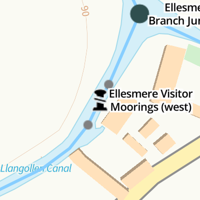 Travel to Ellesmere Branch Junction, then on the Shropshire Union Canal (Llangollen Canal - Ellesmere Branch) to Ellesmere Town Wharf
