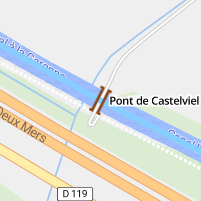 Pont de Castelviel is a minor waterways place on the Canal de Garonne - (Main line) between Garonne - Baïse Jonction (Junction of the Canal de Garonne and the River Baïse) (6.38 kilometres and 2 locks to the northwest) and Quai de Sérignac-sur-Garonne (9.54 kilometres and 1 lock to the east).