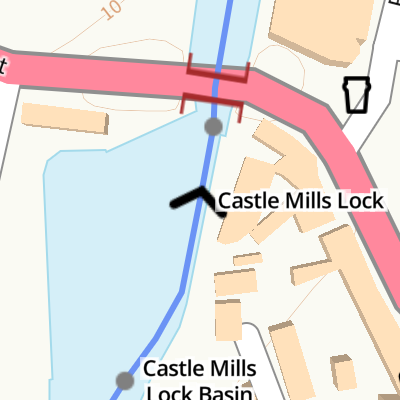 The nearest place in the direction of Castle Mills Bridge is Castle Mills Lock Weir Entrance (Channel leading to the Weir - No Access);
