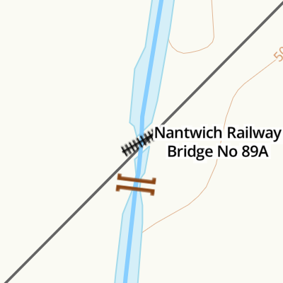 Nantwich Railway Bridge No 89A is a minor waterways place on the Shropshire Union Canal (Birmingham and Liverpool Junction Canal - Main Line) between Newcastle Road Bridge No 62 (10 miles and 6¼ furlongs and 22 locks to the southeast) and Nantwich Aqueduct (1 mile and 1¾ furlongs to the north).