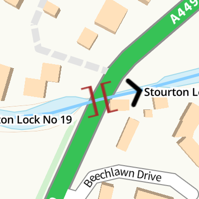 Travel to Stourton Junction, then on the Staffordshire and Worcestershire Canal (Main Line: Stourport to Stourton) to York Street Bridge, then on the Staffordshire and Worcestershire Canal (Stourport Basins: Narrow Route) to Stourport Upper Basin