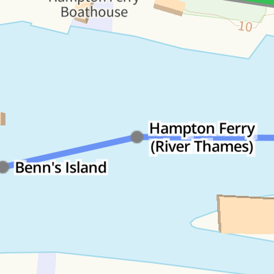 Hampton Ferry (River Thames) is a minor waterways place on the River Thames (below Oxford) between Thames Meadow (East end of Desborough Cut) (3 miles and 6 furlongs and 1 lock to the west) and Thames - Ember Junction (Junction of the River Thames and the River Ember) (1 mile and 1½ furlongs and 1 lock to the southeast).