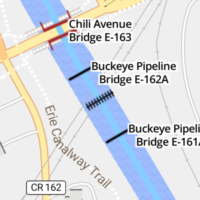 Railway Bridge E-162 is a minor waterways place on the New York State Canal System (Erie Canal) between Erie - Cayuga-Seneca East Junction (Junction of the Erie and Cayuga-Seneca Canals) (60.69 miles and 9 locks to the east) and South Grand Island Bridge (79.34 miles and 2 locks to the west).