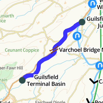 It runs for 2 miles and 2 furlongs from Guilsfield Terminal Basin (which is a dead end) to Guilsfield Branch Junction (where it joins the Shropshire Union Canal (Montgomery Canal - isolated navigable section)).